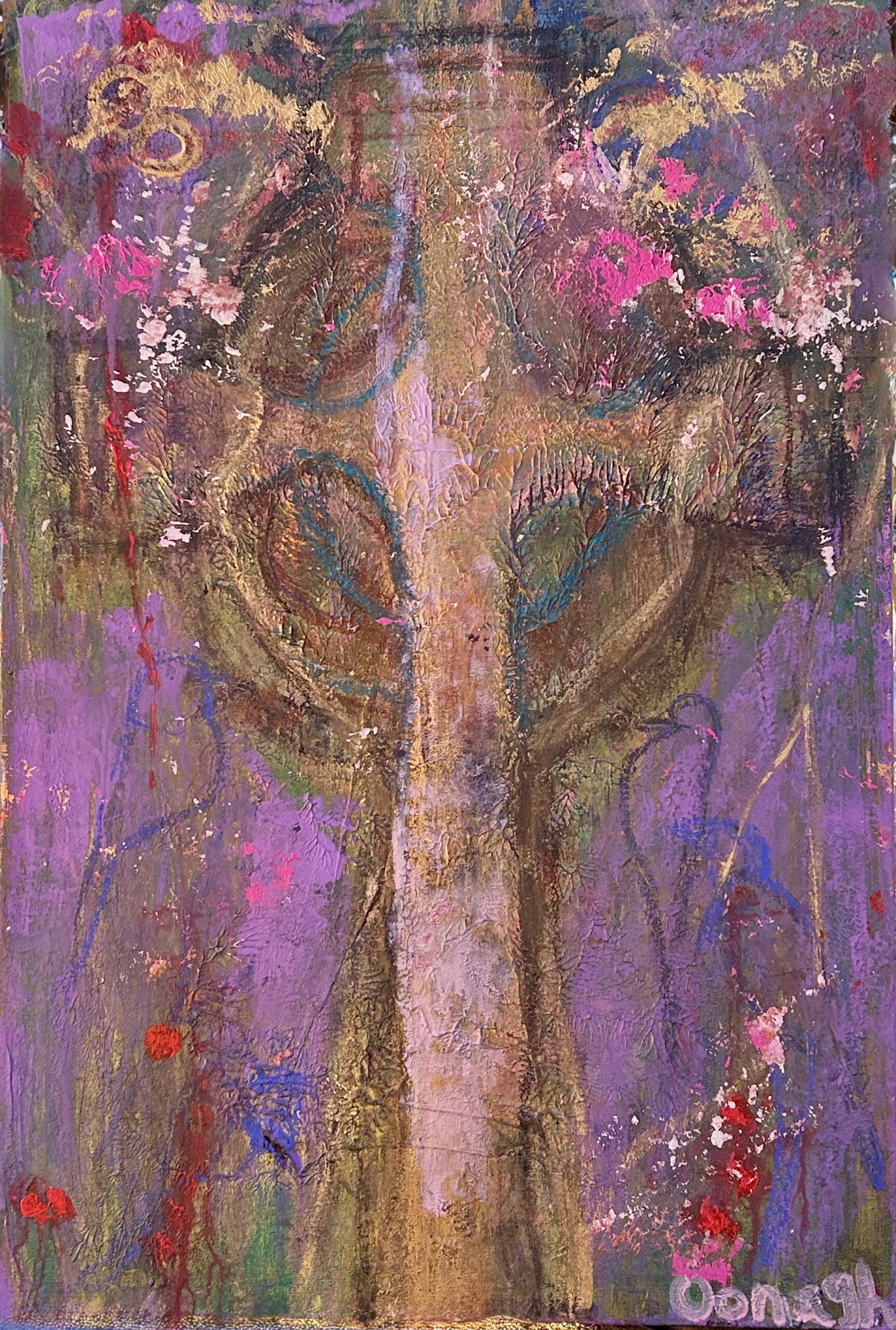 “The Druids Return to Cloinmacnoise” acrylic & mixed media, (rose, pinon, sea water) 36 x 24, $3,330